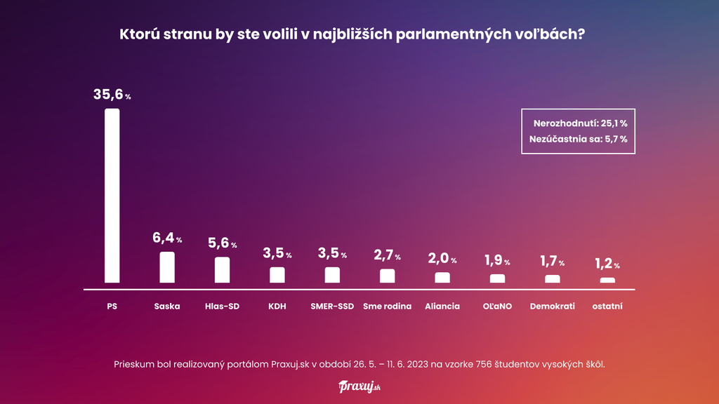 Portál Praxuj.sk prieskum zrealizoval v období od 26.5. do 11.6.2023 na vzorke 756 študentiek a študentov 14 najväčších verejných vysokých škôl na Slovensku.