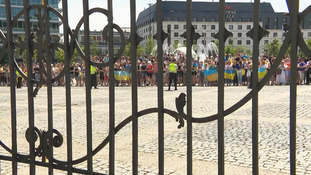 Pred Prezidentským palácom sa na podporu Volodymyra Zelenského zhromaždilo množstvo ľudí s ukrajinskými vlajkami.