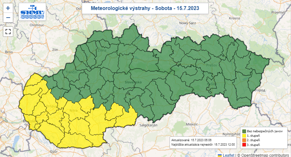 Výstraha platí v sobotu približne od 14.00 h do 18.00 h. Týka sa Bratislavského, Nitrianskeho a Trnavského kraja. Rovnako aj okresov Veľký Krtíš a Krupina.