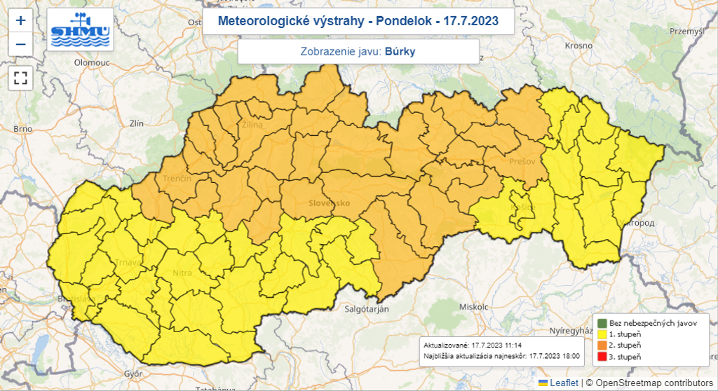 Druhý stupeň výstrahy pred búrkami je vydaný pre celý Žilinský kraj i pre väčšinu okresov Trenčianskeho a Prešovského kraja. Tiež pre okresy Spišská Nová Ves, Rožňava, Gelnica, Rimavská Sobota, Revúca, Brezno a Banská Bystrica.