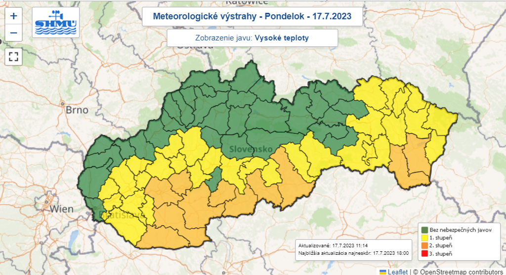 Teplota tam môže dosiahnuť 35 stupňov Celzia. Vo viacerých okresoch Slovenska, s výnimkou Žilinského kraja, platí najnižší stupeň výstrahy pred vysokými teplotami. Vydané sú do 18.00 h.