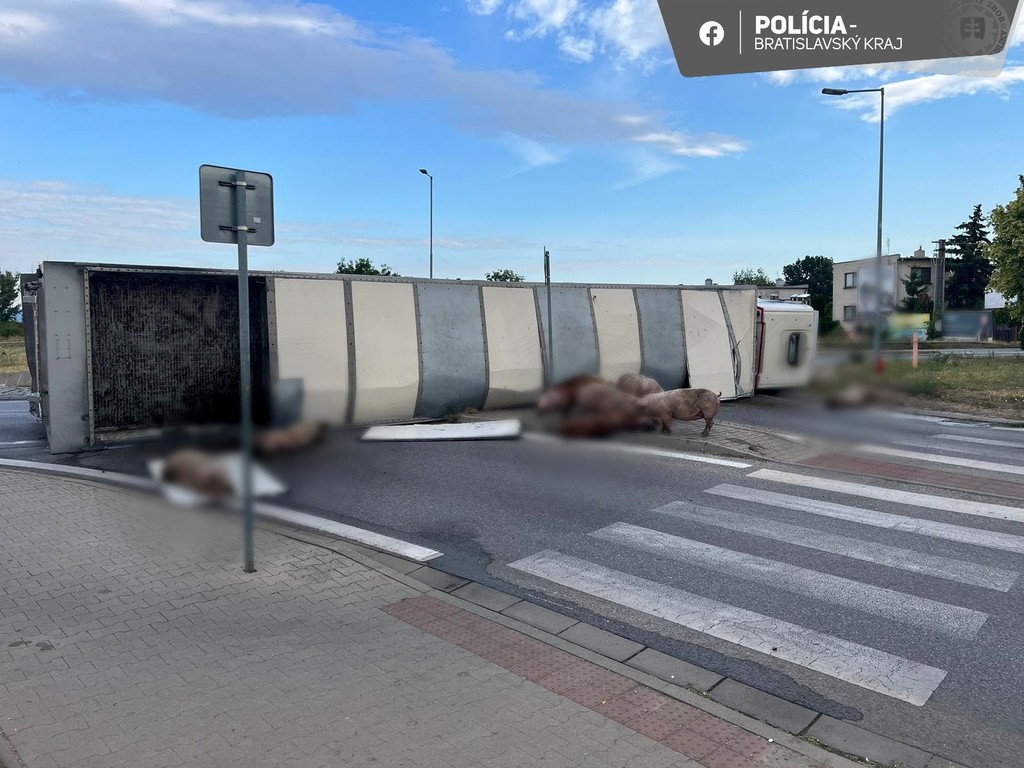 V Senci sa na kruhovom objazde prevrátil kamión, ktorý prevážal ošípané. Časť zvierat uhynula, ďalšie sa pohybujú v okolí miesta nehody.