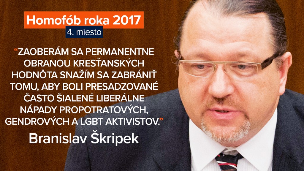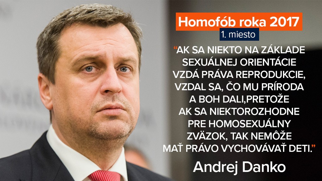 Predseda parlamentu Andrej Danko sa stal víťazom šiesteho ročníka ankety o Homofób. Anticenu získal za výrok: „Ak sa niekto na základe sexuálnej orientácie vzdá práva reprodukcie, vzdal sa, čo mu príroda a Boh dali, pretože ak sa niekto rozhodne pre homosexuálny zväzok, tak nemôže mať právo vychovávať deti."