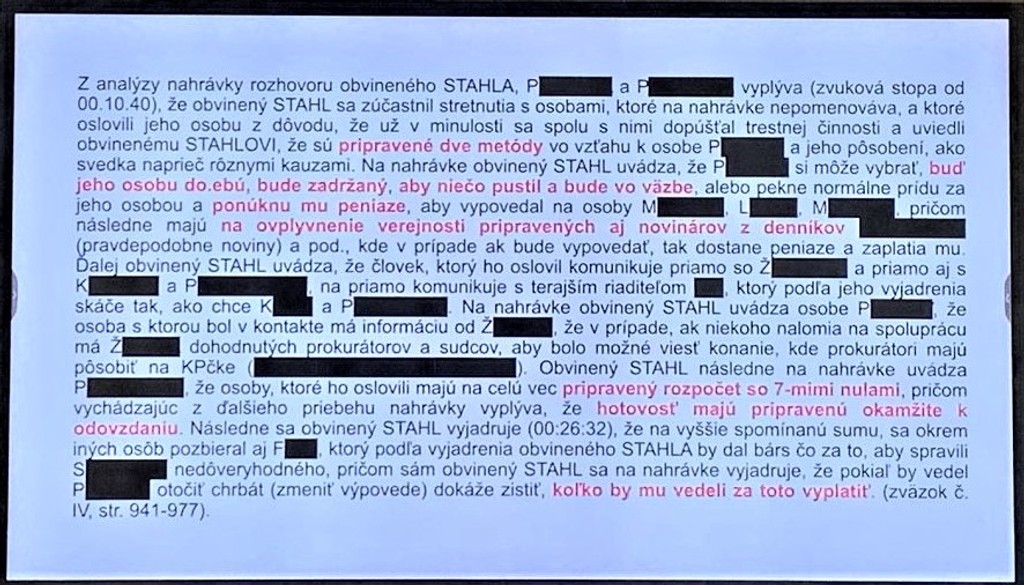 Na nahrávke mal byť obvinený Stahl a tiež ďalšie osoby. Ich rozhovor bol o tom, že pre osobu označenú písmenom P. existujú iba dve cesty - spolupráca a teda prijatie úplatku, alebo väzobné stíhanie. Mená polícia začiernila.