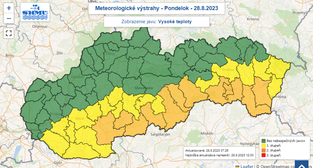 Výstraha druhého stupňa pred vysokými teplotami sa týka okresov Levice, Veľký Krtíš, Krupina, Lučenec, Rimavská Sobota, Revúca, Rožňava, Košice mesto, Košice-okolie, Trebišov a Michalovce. Teplota tam môže miestami dosiahnuť 35 až 36 stupňov Celzia. Výstraha platí predbežne od 13.00 do 18.00 h.