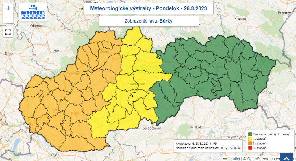 Niekde pritom hrozia ešte silnejšie búrky. Pre niektoré okresy SHMÚ počas dňa vydalo aj výstrahu druhého stupňa. Platí v pondelok od 20.00 h do polnoci.