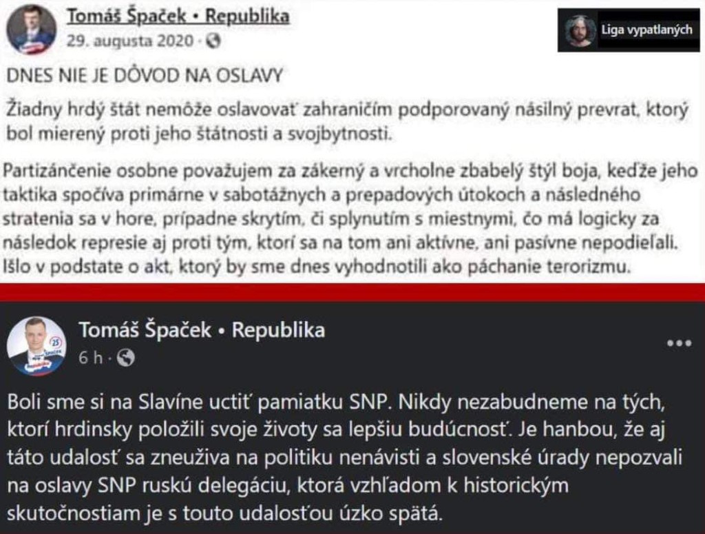 Ani najnovšie výroky veľmi nehrajú do scenára, že Republika razí antifašistický ráz. Sociálnymi sieťami sa totiž šíri status kandidáta Republiky Tomáša Špačeka, ktorý len pred tromi rokmi SNP hanil, teraz si tento sviatok ctil.