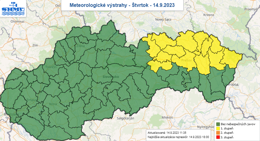Výstraha pred búrkami prvého stupňa platí pre väčšinu Prešovského a časť Košického kraja.