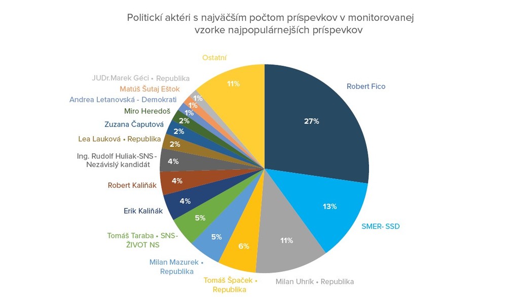Zo spomenutých strán vedú v interakciách najviac Robert Fico za stranu Smer a Milan Uhrík, Milan Mazurek a Tomáš Špaček za stranu Republika.