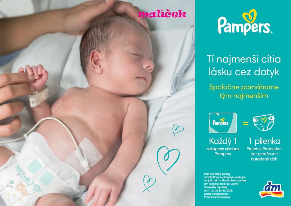 Predčasne narodeným deťom dlhodobo pomáha aj značka Pampers v spolupráci s OZ malíček a dm drogerie markt, a to svojimi plienočkami navrhnutými pre potreby predčasniatok, ktoré pravidelne daruje do všetkých perinatologických centier na Slovensku.