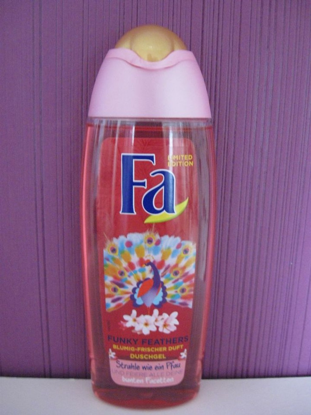 popis: 250 ml, sprchový gél v ružovej plastovej fľaši s obrázkom páva
