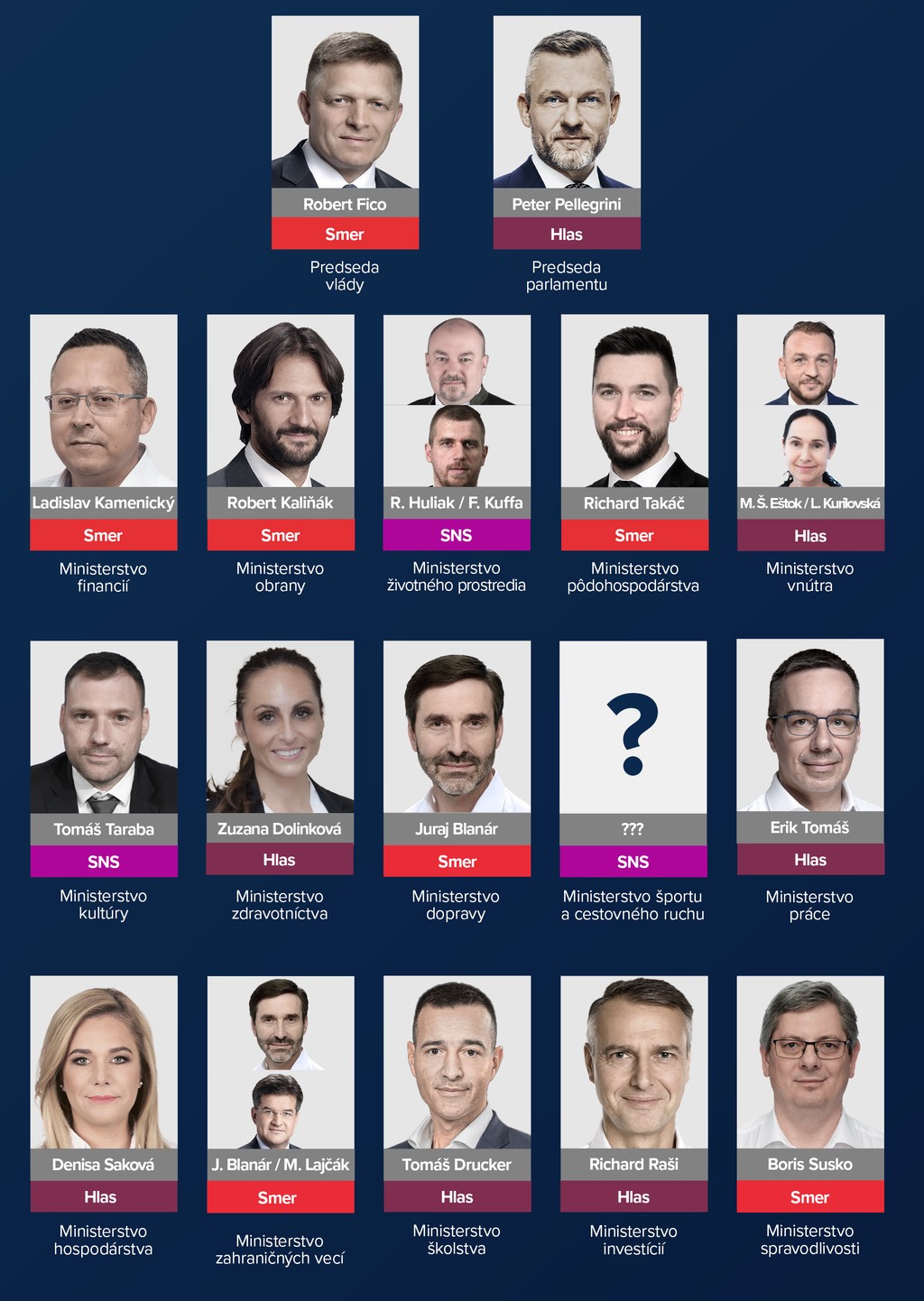 Isté je tiež to, že vznikne nové ministerstvo športu a cestovného ruchu, ktoré pripadne strane SNS. Tá by mala mať pod palcom aj ministerstvo kultúry či životného prostredia. Nominantom by mohol byť Filip Kuffa, ktorý čelí obvineniu za napadnutie farmárov. Pri ministerstve kultúry sa skloňuje meno Tomáša Tarabu.