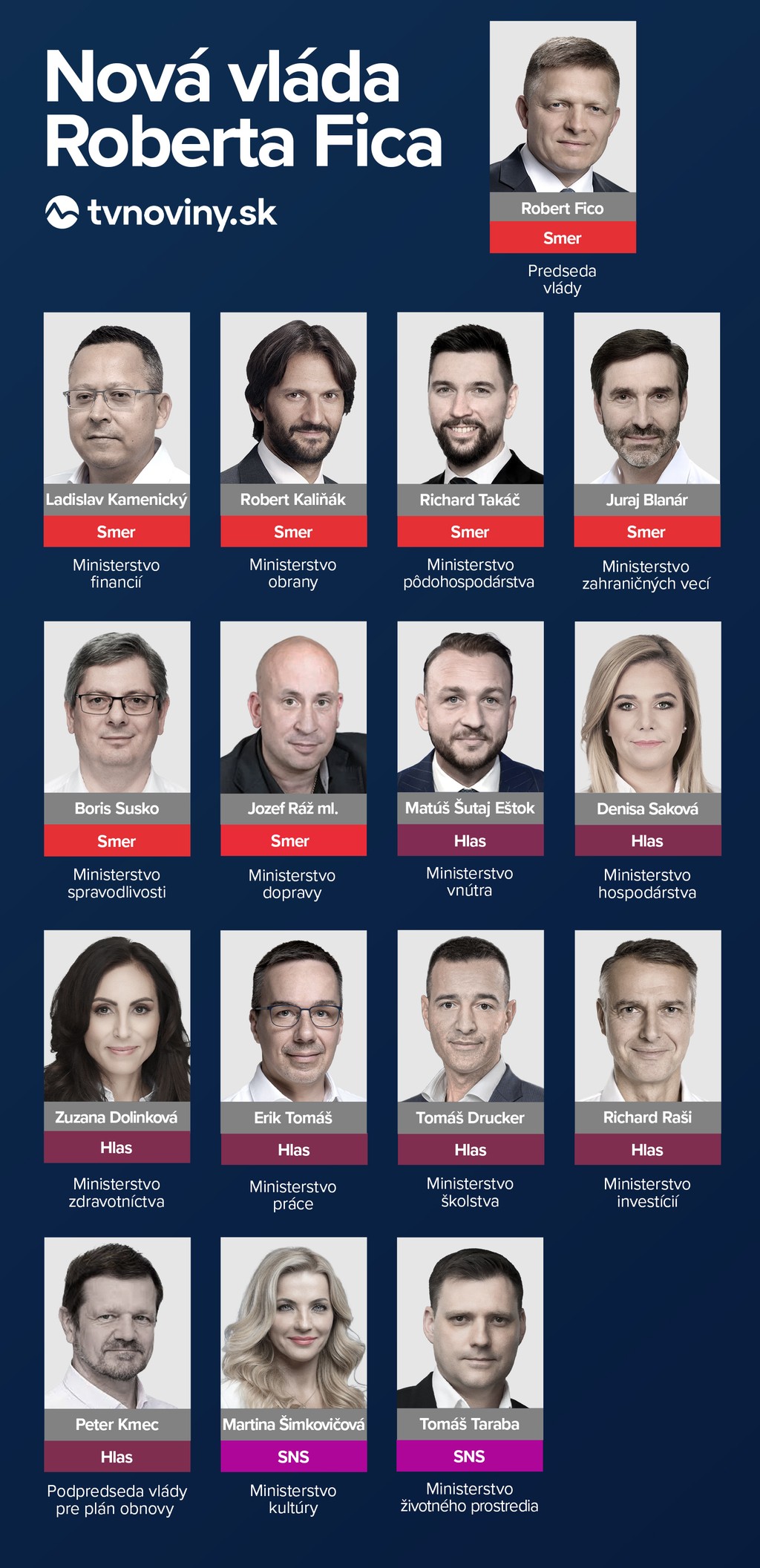 Do ministerských kresiel za SNS zasadne Tomáš Taraba (podpredseda vlády, ministerstvo životného prostredia) a Martina Šimkovičová (ministerstvo kultúry). Obsadí aj nové ministerstvo športu a cestovného ruchu, ktoré má vzniknúť od januára 2024.