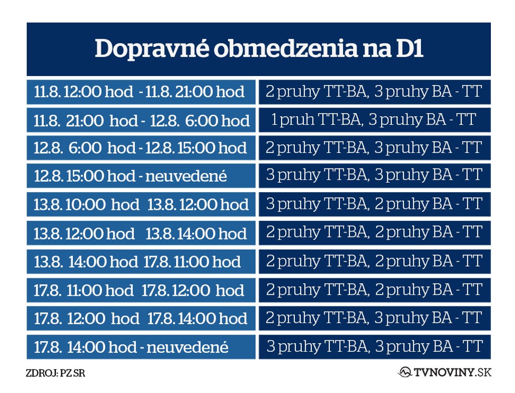 „Od zajtra (11.8.) bude v súvislosti so stavbou križovatky Triblavina na diaľnici D1premávka obmedzovaná priebežným znižovaním počtu jazdných pruhov ako aj znížením najvyššej dovolenej rýchlosti v obidvoch smeroch," uviedla hovorca Krajského riaditeľstva Policajného zboru v Bratislave Michal Szeiff.