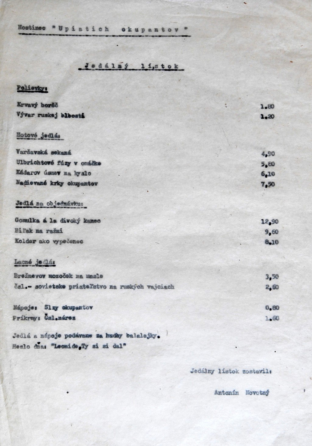 V jedálnom lístku z hostinca U piatich okupantov sa spomínajú vtedajšie vedúce osobnosti štátov, ktoré okupovali Československo. „Sú to napríklad hotové jedlá - varšavská sekaná, Ulbrichtove fúzy v omáčke, to bol generálny tajomník nemeckej socialistickej strany, Kádárov úsmev na kyslo, generálny tajomník maďarskej robotníckej strany, a podobne," doplnil Pavlovič.