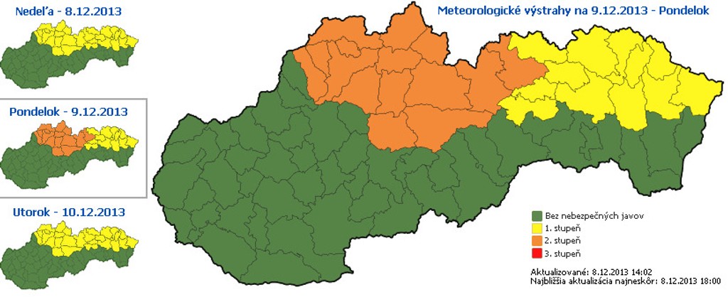 V Košickom kraji sa zase musia pripraviť na snehové jazyky a záveje. Výstraha 1. stupňa tu platí od 23.00 h až do utorka (10.12) do 6.00 h. Tvorba snehových jazykov a závejov predstavuje potenciálne nebezpečenstvo pre dopravné aktivity.