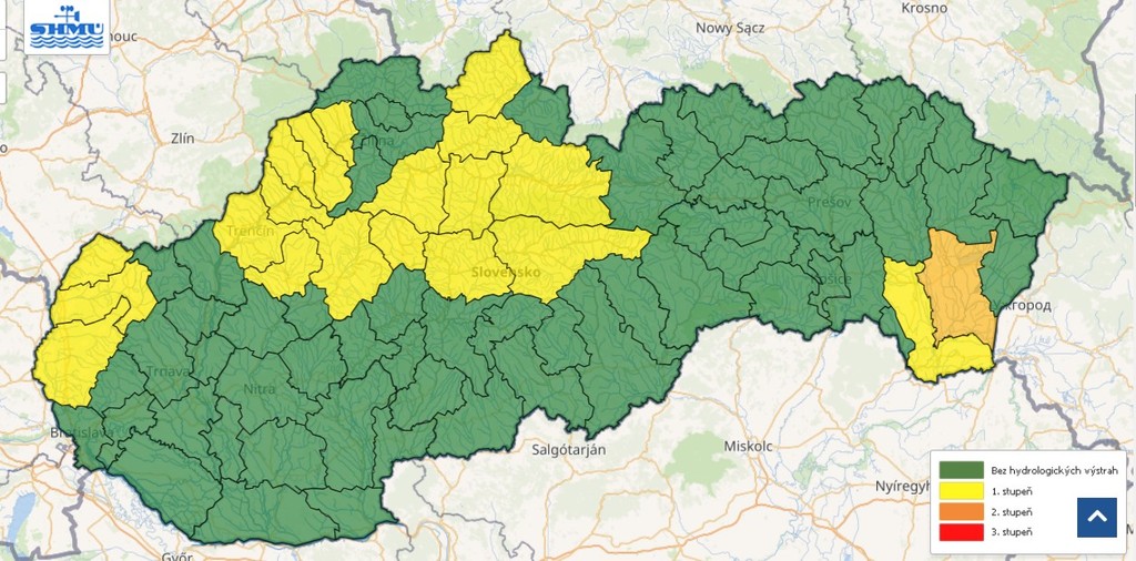 Aktuálna je naďalej tiež hydrologická výstraha pred povodňami pre okresy na Záhorí, Považí, hornej Nitre, Orave, Turci, Liptove, Horehroní i dolnom Zemplíne. V okresoch Michalovce, Bánovce nad Bebravou a Prievidza je platná zvýšená výstraha druhého stupňa.