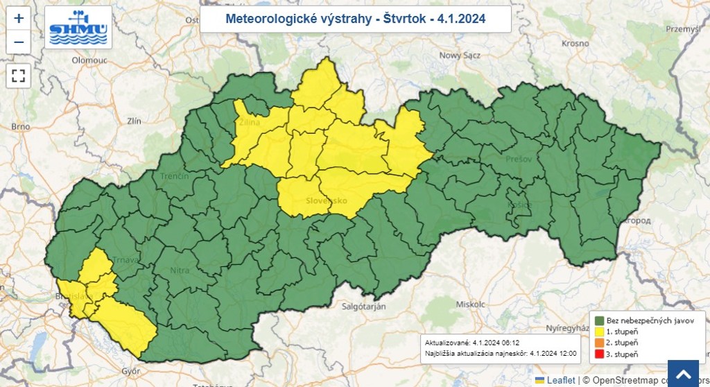 Výstraha pre juhozápad platí do štvrtkového podvečera, pre okresy pod Tatrami do piatkového (5. 1.) rána.