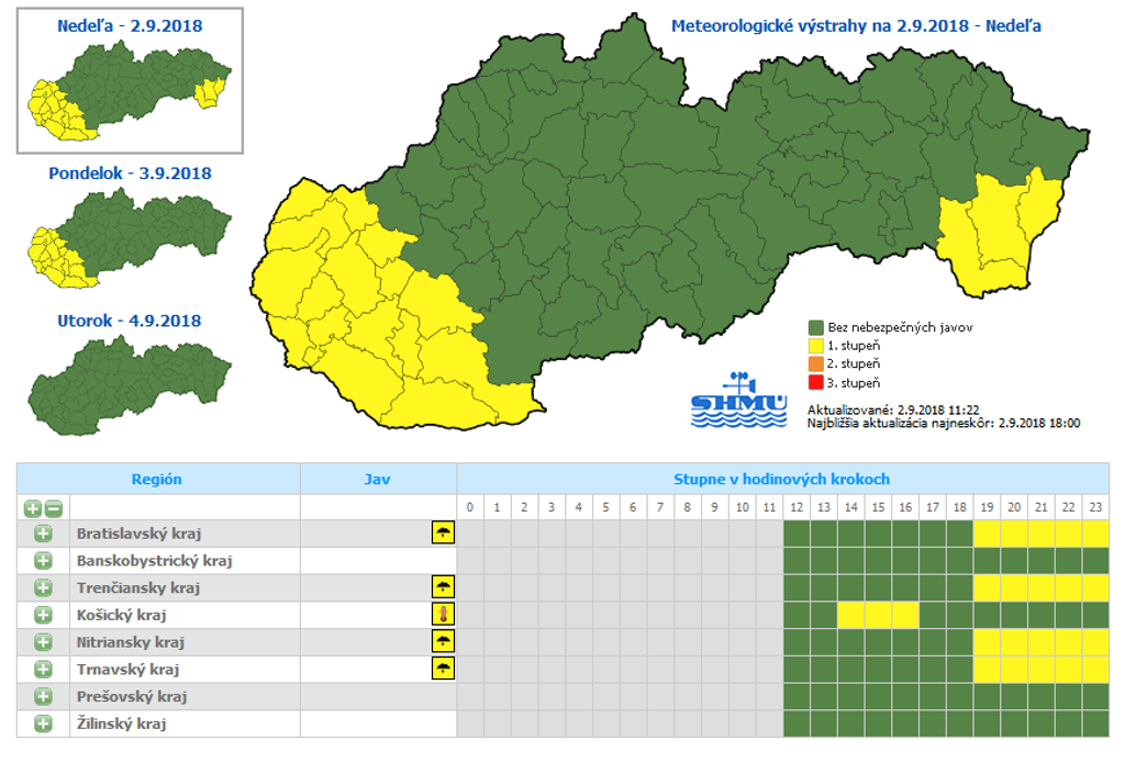 V nedeľu večer treba na západnom Slovensku opäť počítať s intenzívnym dažďom. Slovenský hydrometeorologický ústav (SHMÚ) upozorňuje na zvýšenú pravdepodobnosť búrok s krúpami od 19. h. Výstraha 1. stupňa má platiť až do nedeľného rána. Okresy Trebišov, Michalovce a Sobrance, naopak, poobede zasiahnu horúčavy.