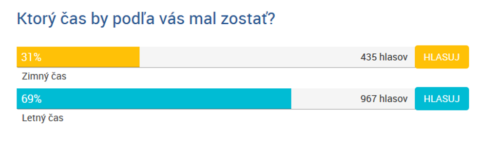 Až 69 percent Slovákov preferuje ponechanie letného času, tj. ponechanie neskoršieho západu slnka na úkor neskoršieho východu. Zimný čas, teda opak, preferuje 31 percent zúčastnených.