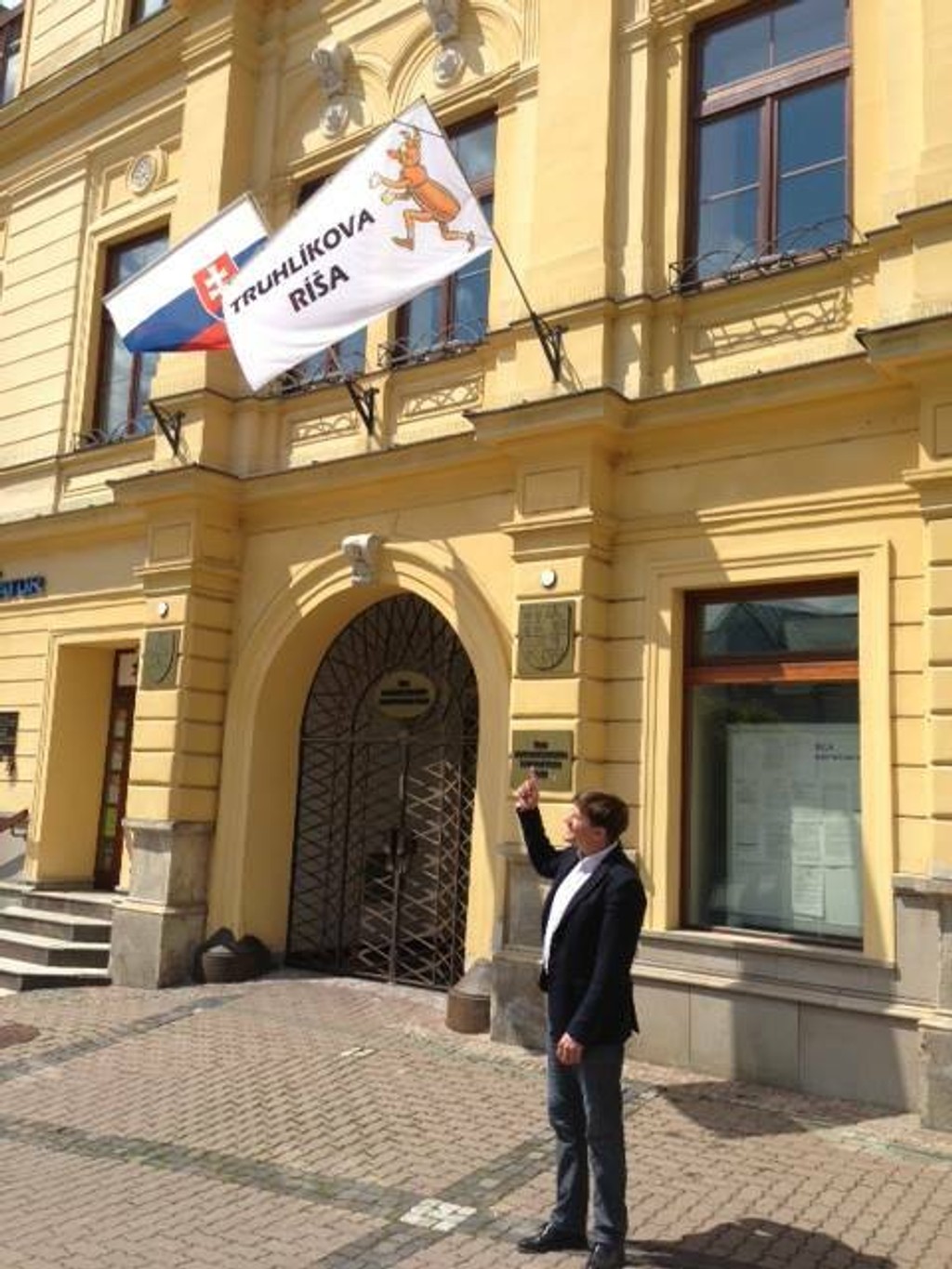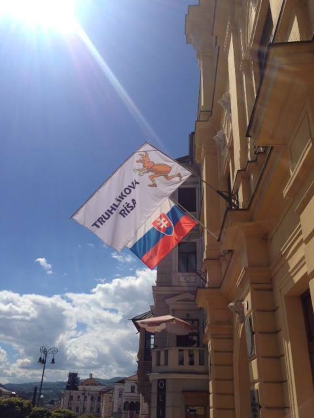 Poslanec Národnej rady SR Alojz Hlina opäť vyvádzal. Navštívil Banskú Bystricu, aby tamojšiemu županovi daroval namiesto vlajky Európskej únie novú vlajku - Truhlíkovej ríše.