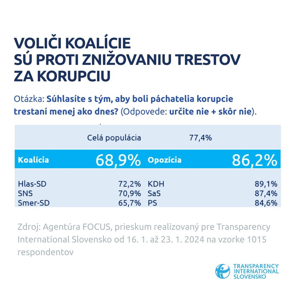 Riaditeľ TIS Michal Piško konštatoval, že podiel koaličných voličov s kritickým názorom na oslabovanie trestov za korupciu sa od celej vzorky líši len mierne. V prieskume sa pýtali aj na odhad rozsahu prísneho trestania korupcie.