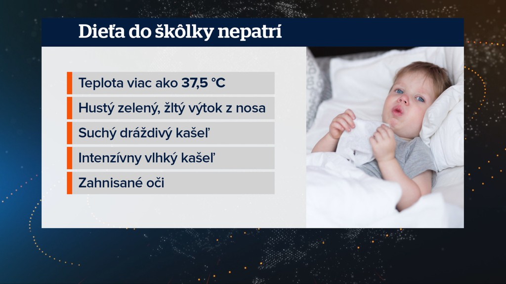 Číry vodnatý sopeľ nie je dôvodom na vrátenie dieťaťa. Škôlkara pošlú domov, ak má teploty nad 37,5 stupňa, hustý zelený či žltý výtok z nosa, suchý dráždivý kašeľ alebo intenzívne vlhko kašle.