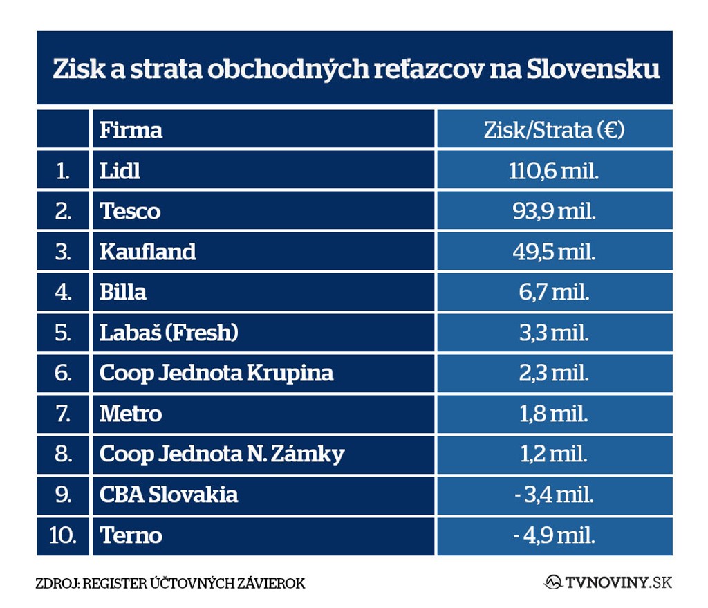 Z top desiatky najväčších obchodných reťazcov sa v roku 2017 nedarilo len dvom domácim predajcom. Terno s CBA Slovakia skončili v červených číslach.