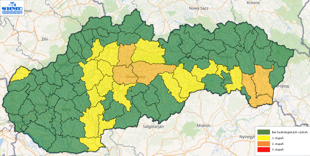 Výstraha druhého stupňa platí pre okresy Michalovce, Trebišov bez Roňavy, Brezno, Banská Bystrica, Ružomberok a Levice západ.