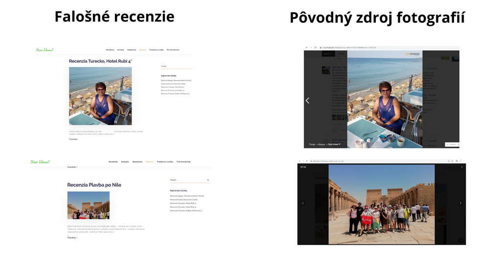 Údajná pani Mária Farkašová si v recenzii chváli plavbu po Níle, na ktorej mala byť v januári. Fotografiu, ktorá je k textu priložená, sme našli na stránke inej cestovnej kancelárie. Na pôvodnej neorezanej snímke sa dokonca nachádza zástava s názvom cestovnej kancelárie Satur.