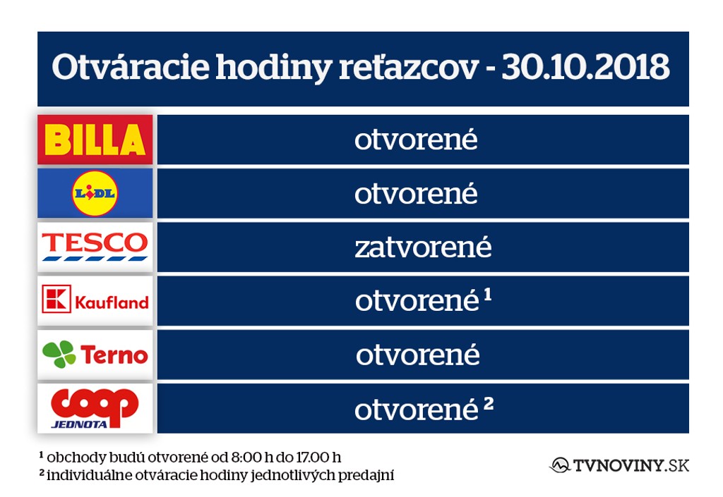 „Billa bude mať dňa 30.10. svoje predajne otvorené. Čo sa týka otváracích hodín, väčšina predajní bude otvorená ako počas nedele," uviedla hovorkyňa spoločnosti Kvetoslava Kirchnerová.