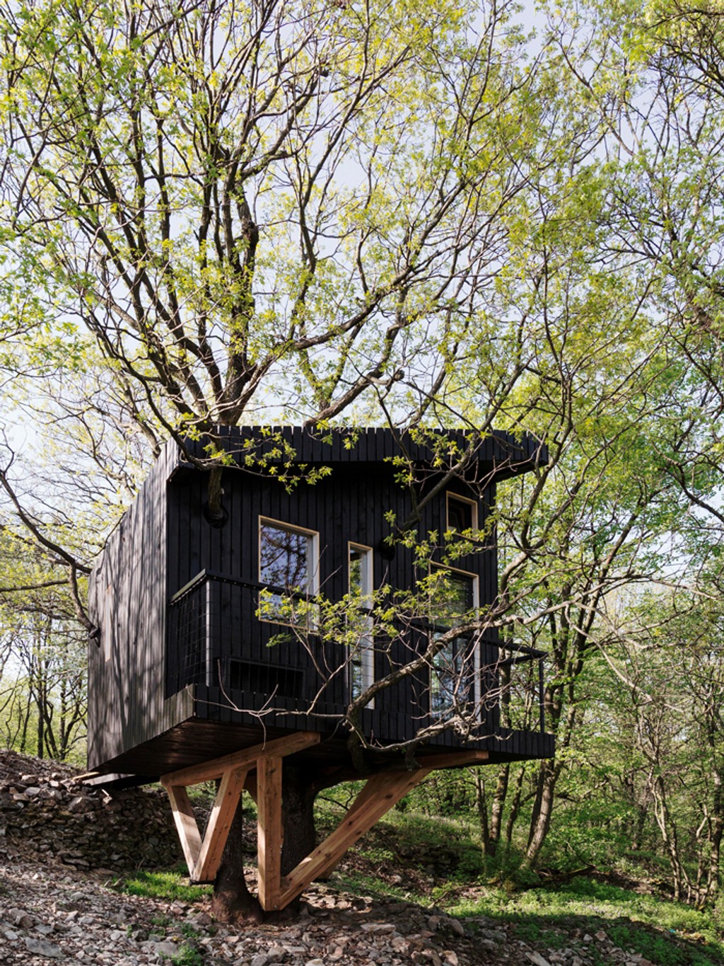 Na kopec tak v spolupráci s architektom zasadil domček, ktorý absolútne splýva s prírodou. Dané je to už tým, že dispozíciu a rozmery určuje strom, na ktorom je „zavesený“. Pôdorys plánovanej drevostavby vopred neexistoval, určil ho až vybratý strom, slúžiaci ako nosný prvok. Detský sen o obývateľnom úkryte medzi konármi sa tak stal skutočnosťou. A to bez toho, aby bolo stromu akokoľvek ublížené. Nezvyčajný príbytok je obývateľný celoročne.