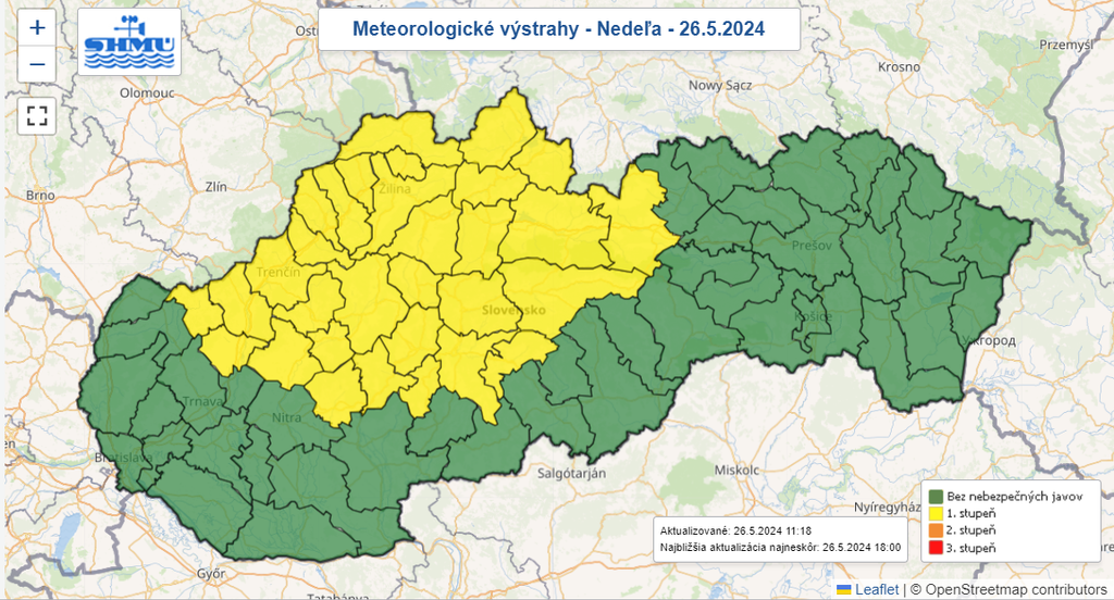 S búrkami treba počítať aj v nedeľu. Výstraha prvého stupňa platí pre okresy všetkých krajov s výnimkou Bratislavského a Košického. Trvá od 12.00 do 20.00 h. Slovenský hydrometeorologický ústav (SHMÚ) o tom informoval na svojom webe.