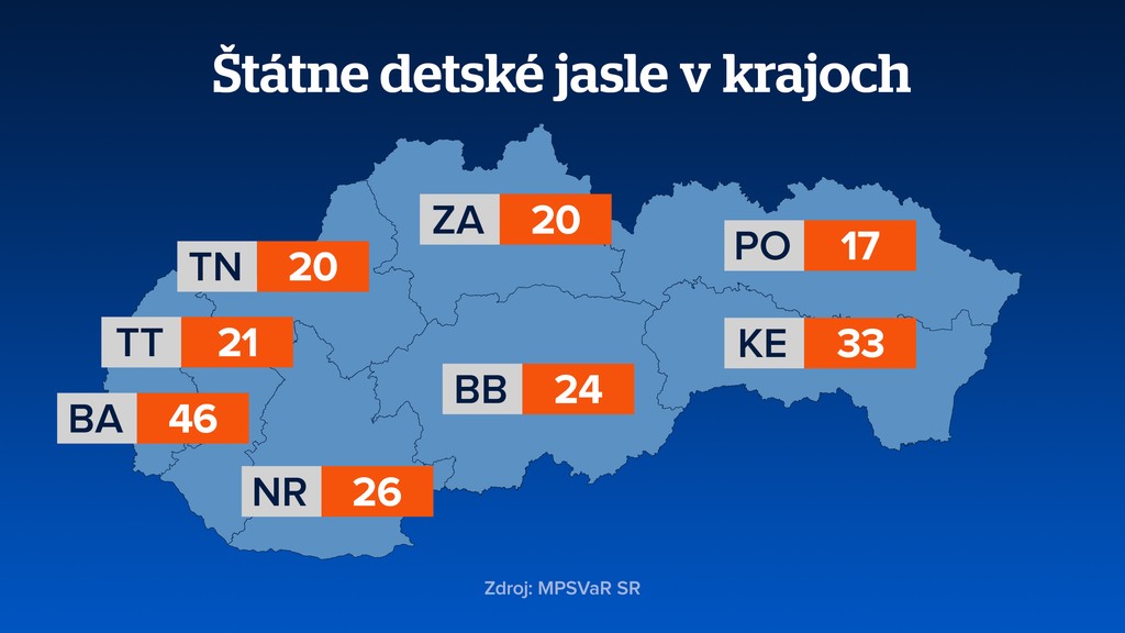 Zostaňme však pri štátnych zariadeniach. Ministerstvo práce nám poskytlo údaje zo svojej analýzy. Na Slovensku funguje 207 štátnych jaslí, kam chodia deti vo veku od 18 mesiacov do troch rokov. Celková kapacita je vyše 3700 miest.