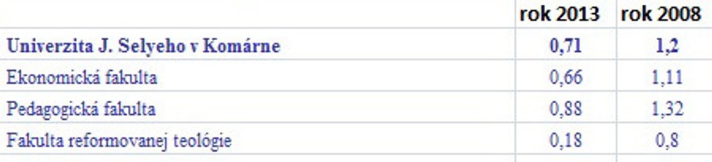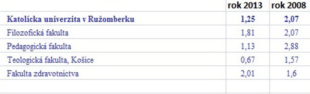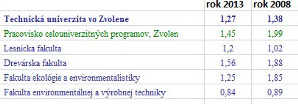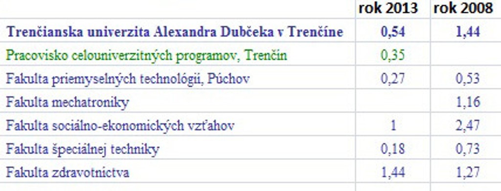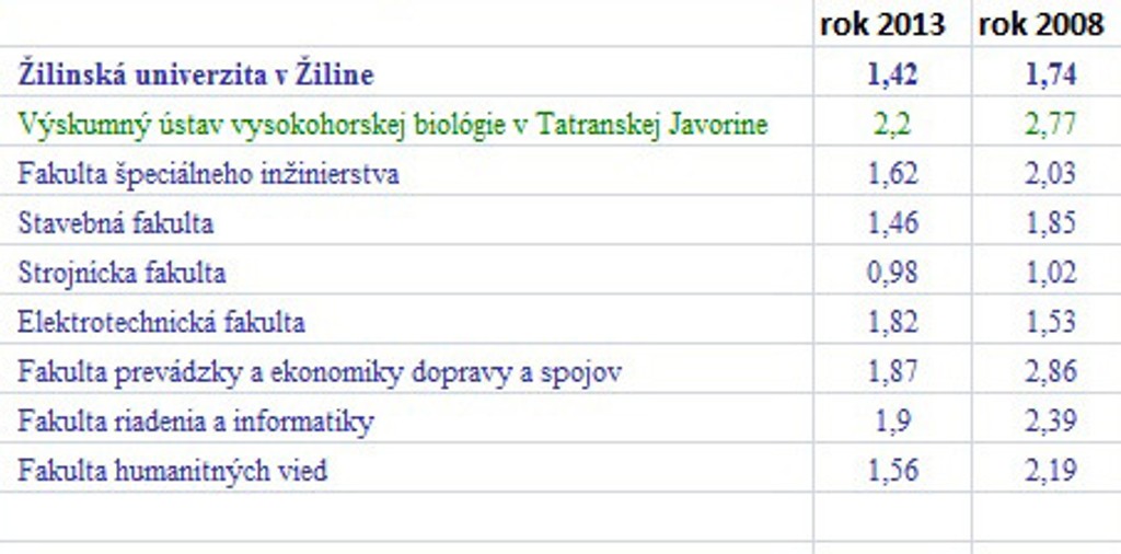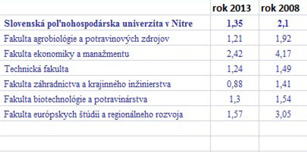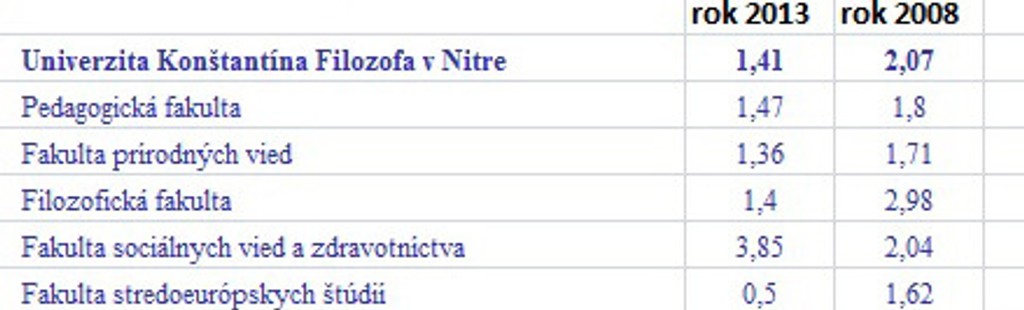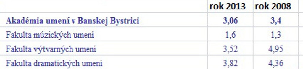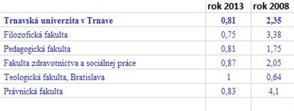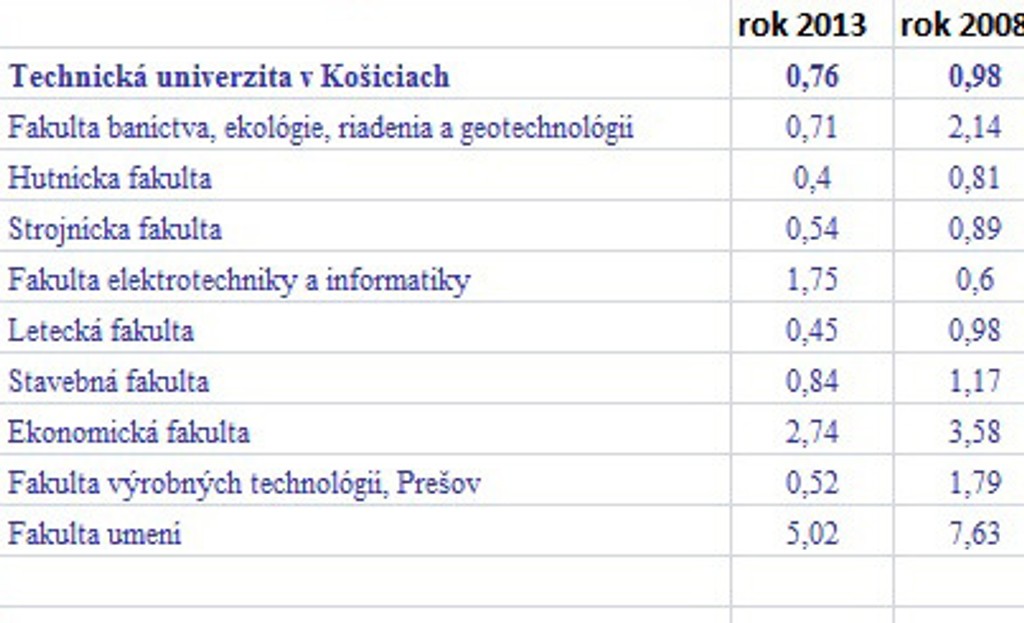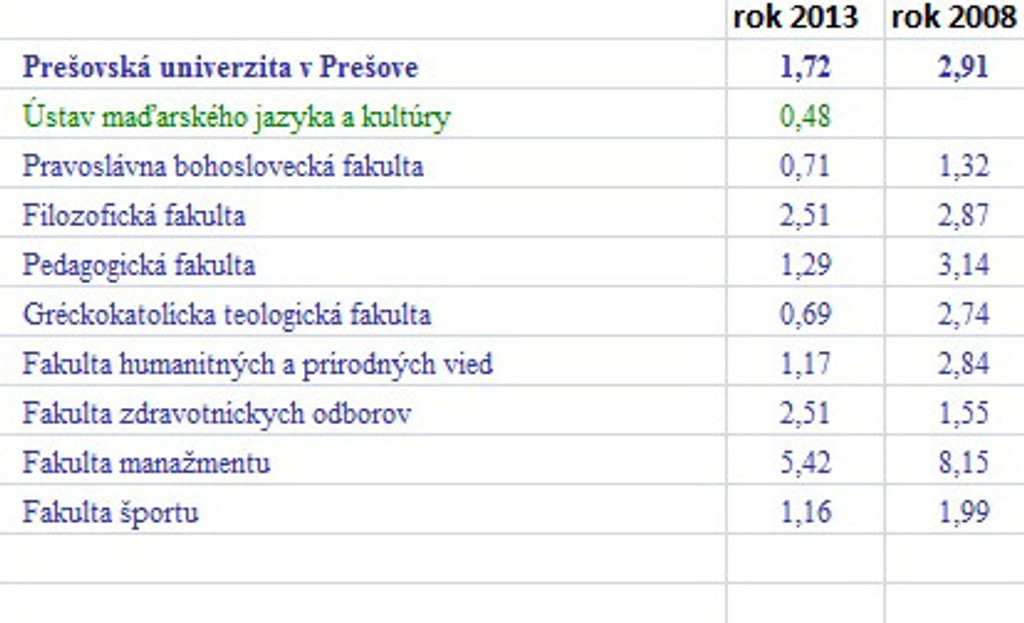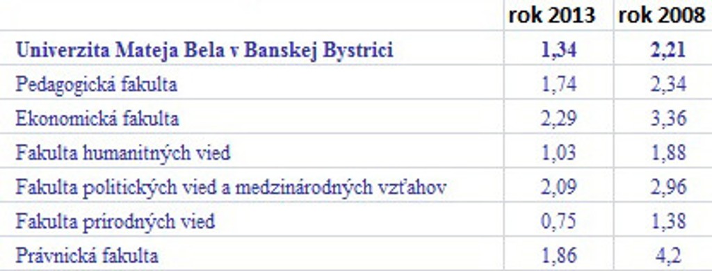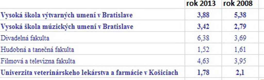 Prehľad o počte prihlášok pripadajúcich na jedno voľné miesto v rokoch 2013 a 2008 na verejných vysokých školách: