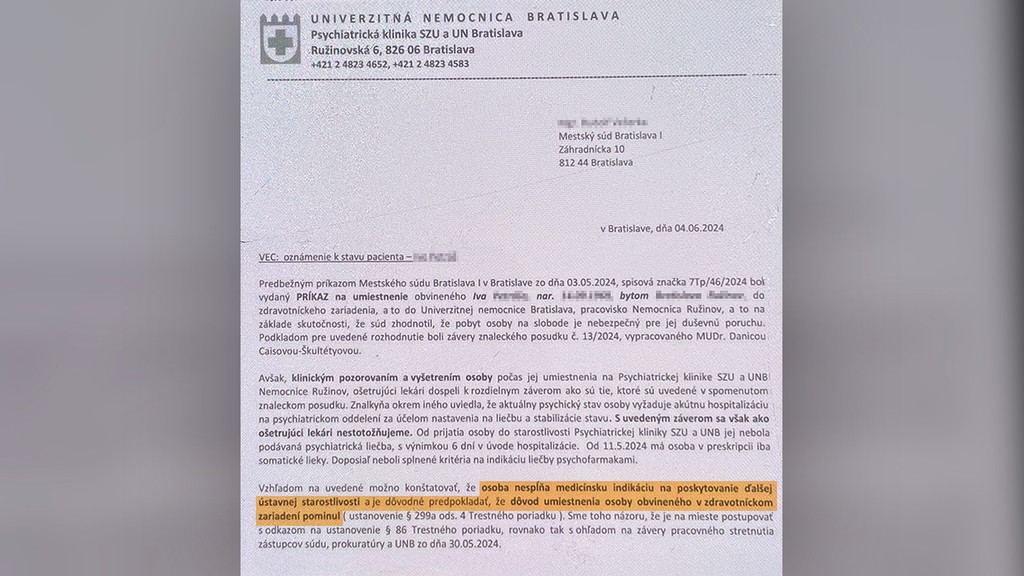 Teraz sa však objavil dokument, v ktorom iní psychiatri nesúhlasia so závermi znalkyne Danice Caisovej. Pozorovali ho a vyšetrili na klinike v Ružinove ešte pred rozhodovaním o jeho osude. V oznámení súdu píšu, že od jeho prijatia mu nepodávali psychiatrickú liečbu s výnimkou šiestich dní v úvode hospitalizácie.