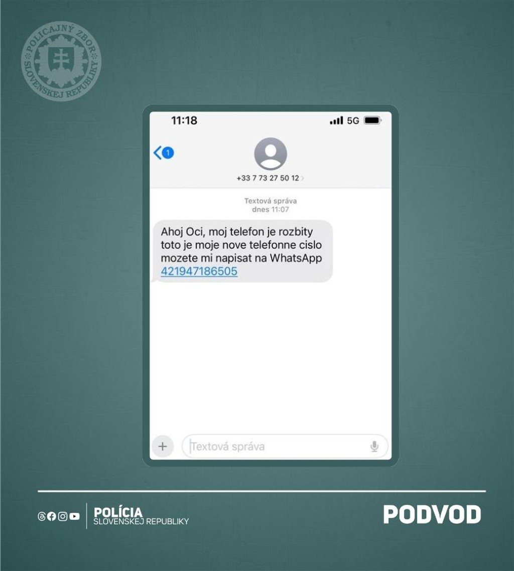 Len v stredu (3.7.) polícia informovala o podvodných telefonátoch, ktoré sa vydávajú za Políciu Slovenskej republiky. Dnes upozorňuje na podvodné SMS správy.