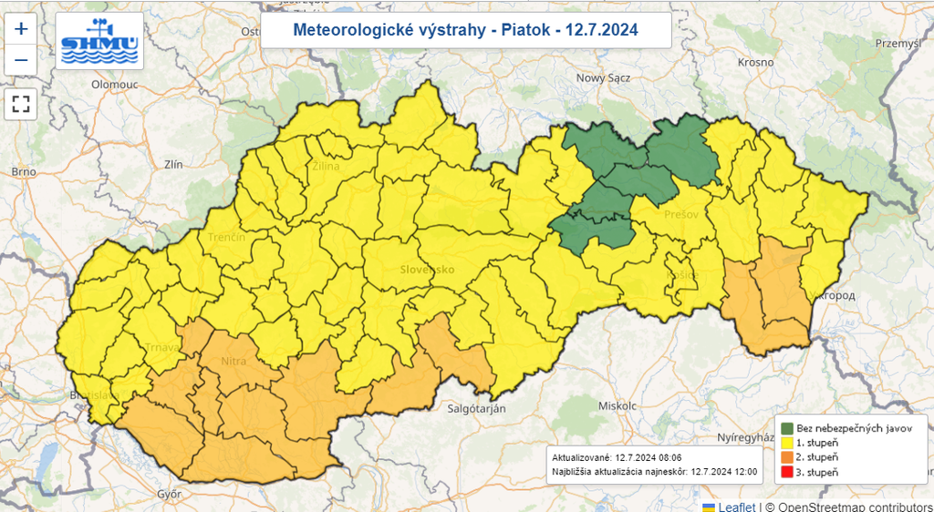 Výstraha prvého stupňa pred búrkami platí od 15.00 h pre celý Bratislavský, Trnavský, Trenčiansky a Žilinský kraj, viaceré okresy v Nitrianskom a Banskobystrickom kraji a tiež pre okresy Kežmarok a Poprad.