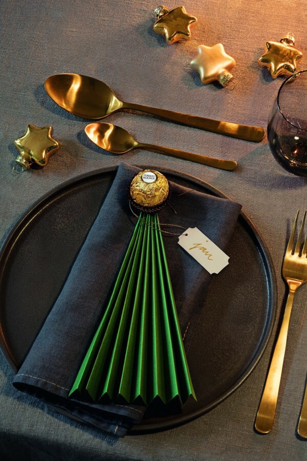 Od vonkajšieho okraja prehýbajte papier pomocou pravítka tak, aby vznikol tvar vejára. Nakoniec naaranžujte na stôl ako stromček so zlatou pralinky Ferrero Rocher na vrchole - a je hotovo!