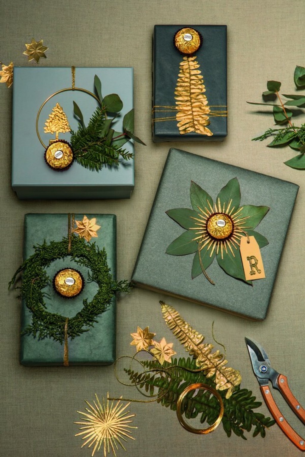 Nebojte sa spolu s papierovými dekoráciami zakomponovať na balíček aj prírodné materiály, čerstvé vetvičky a slamené ozdoby. Na pripevnenie použite medený drôtik, ktorý sa svojou farbou bude do kompozície skvele hodiť. Nemusíte ho preto skrývať, ale naopak - využite ho ako estetický prvok. So všetkým bude skvelo ladiť pralinka Ferrero Rocher, zlatá čerešnička na torte.