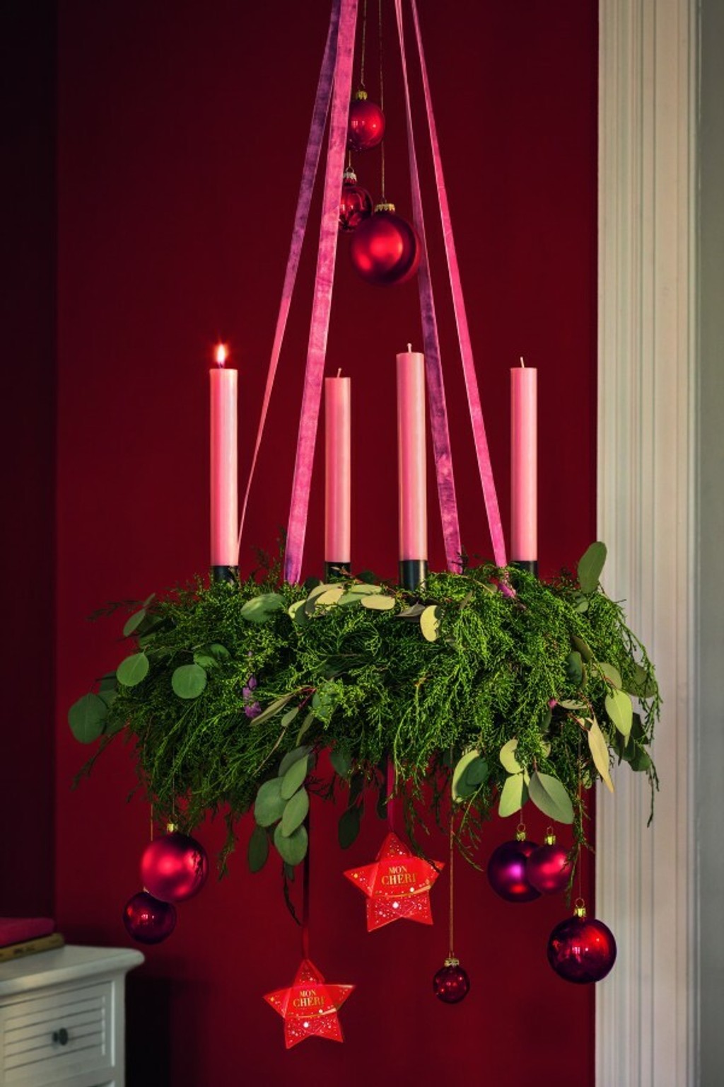 Kúpte si do červena ladenú stuhu na zavesenie a rozdeľte ju na dva rovnaké diely. Ich konce priviažte na protiľahlú stranu venca medzi sviečky. Až veniec zavesíte, dozdobte ho zospodu červenými vianočnými ozdobami a hviezdičkami s lahodnými pralinkami Mon Chéri.
