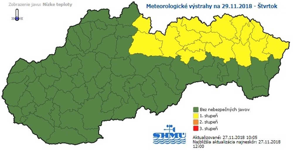 Meteorológovia vydali na štvrtok výstrahu 1. stupňa pred nízkymi teplotami až pre 16 okresov Slovenska.