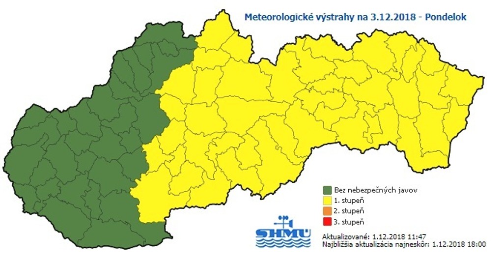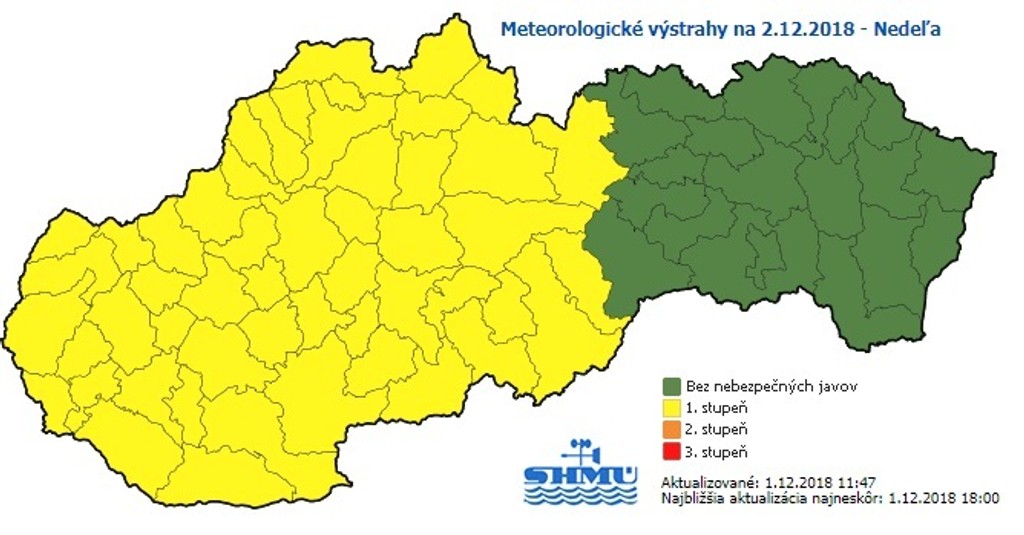 Výstraha počas nedele platí od 9.00 h pre Bratislavský, Banskobystrický, Trenčiansky, Nitriansky a Trnavský kraj. Pre Žilinský kraj platí od 18.00 h.