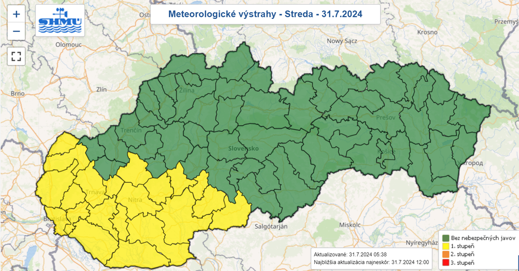 Výstrahy platia pre celý Bratislavský a Nitriansky kraj, takmer celý Trnavský kraj a okresy Banská Štiavnica, Krupina, Veľký Krtíš a Žarnovica.