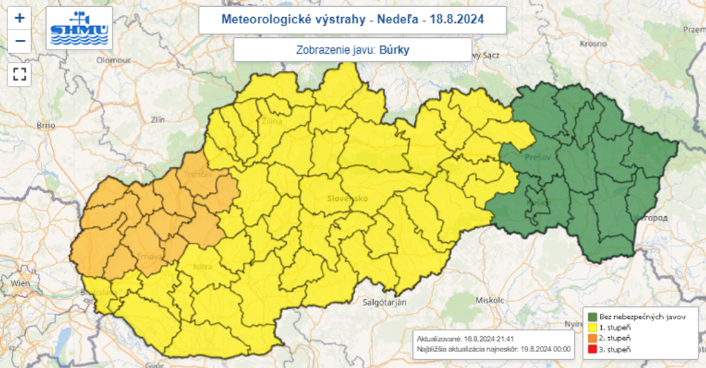 Slovenský hydrometeorologický ústav vydal pred búrkami výstrahy do pondelka (19. 8.) do 6.00 h.
