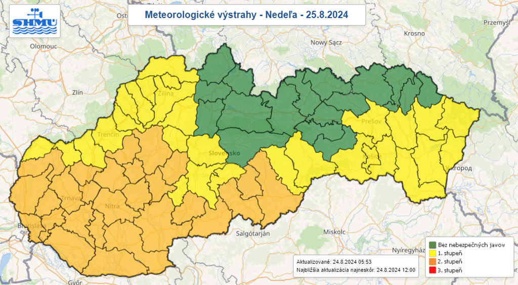 Druhostupňová výstraha bude platiť od 13.00 do 18.00 h v celom Bratislavskom, Nitrianskom a väčšine Trnavského kraja. Tiež v okresoch Prievidza, Partizánske, Žarnovica a Žiar nad Hronom.
