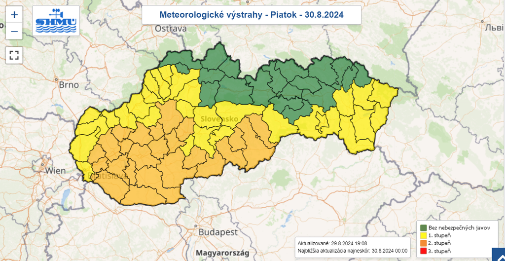 Slovenský hydrometeorologický ústav (SHMÚ) avizuje výstrahy prvého a druhého stupňa. V niektorých okresoch najmä južného a juhozápadného Slovenska môže teplota vzduchu dosiahnuť 35 stupňov Celzia.