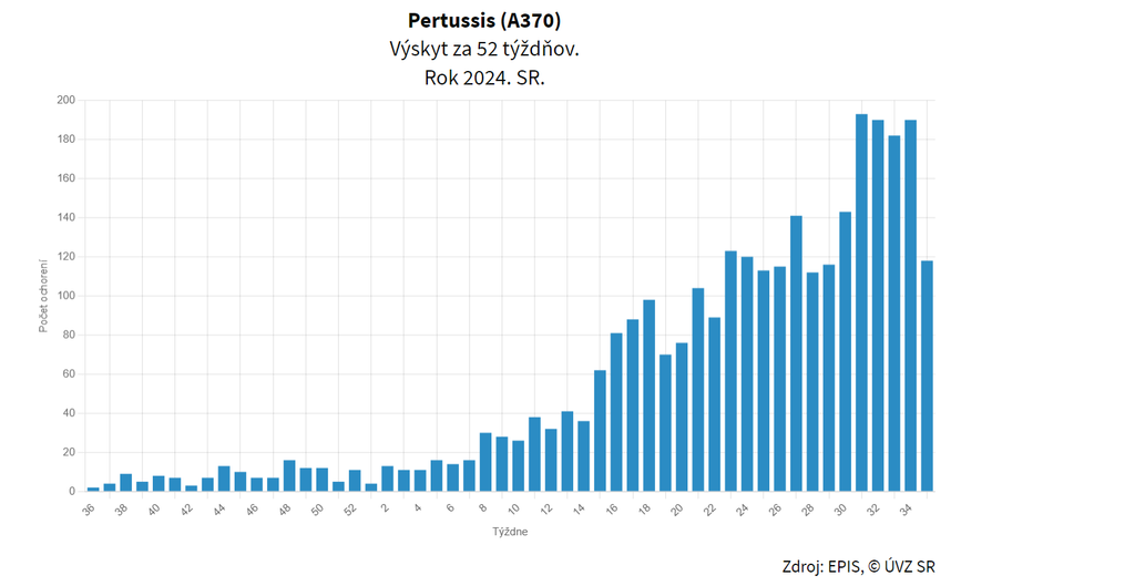 U susedov dosiahli čísla čierneho kašľa rekordy. Tento rok ide o doteraz najväčšiu epidémiu. Zvýšený výskyt sme zachytili aj u nás. Počty sa začali výrazne zvyšovať na jar. Na prelome júla a augusta sme už mali 193 prípadov. Aktuálne čísla klesli na 112.