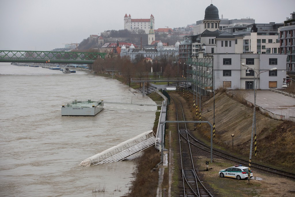 Mimoriadna udalosť v Bratislave na rieke Dunaj. Pontón, na ktorom sa nachádzala reštaurácia Knajpa pri nákupnom centre Eurovea, sa odtrhol a plával dole prúdom.