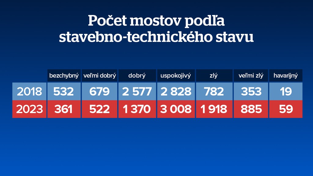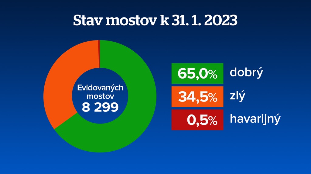 Na Slovensku máme viac než 8-tisíc mostov, z toho v dobrom stave je len 65 percent. Zvyšok – niečo vyše 30 percent je na tom zle a pol percenta je v havarijnom stave.